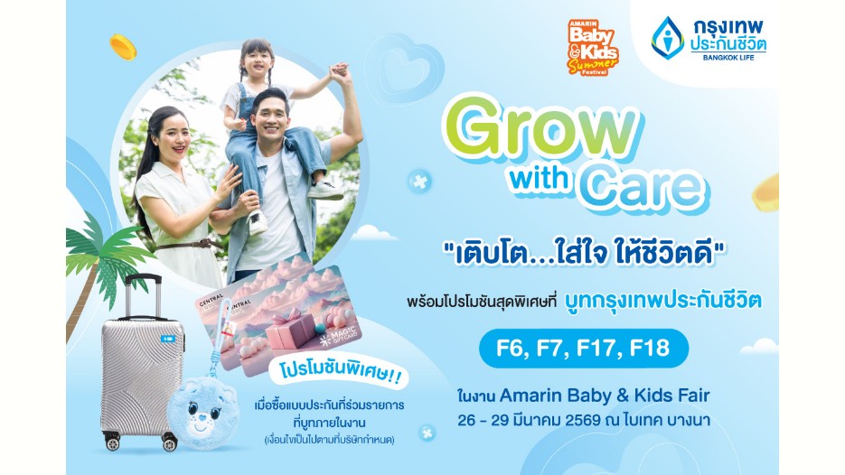 กรุงเทพประกันชีวิต เดินหน้าส่งเสริมการวางแผนอนาคตอย่างมั่นคง ชวนคุณพ่อคุณแม่ยุคใหม่เตรียมความพร้อมให้ลูกน้อยเติบโตอย่างมีคุณภาพและอุ่นใจในทุกช่วงชีวิต ร่วมออกบูทในงาน “Amarin Baby & Kids Fair Summer 2026” ภายใต้แนวคิด Grow with Care ถ่ายทอดความหมายของความ “ใส่ใจ” ผ่านแผนประกันสุขภาพและเงินออมที่ออกแบบมาเพื่อตอบโจทย์ทุกเป้าหมายของครอบครัว ครอบคลุมทั้งความคุ้มครองด้านสุขภาพ ค่ารักษาพยาบาล และการวางแผนเงินออมเพื่ออนาคตทางการศึกษาของลูกรักอย่างรอบด้าน
