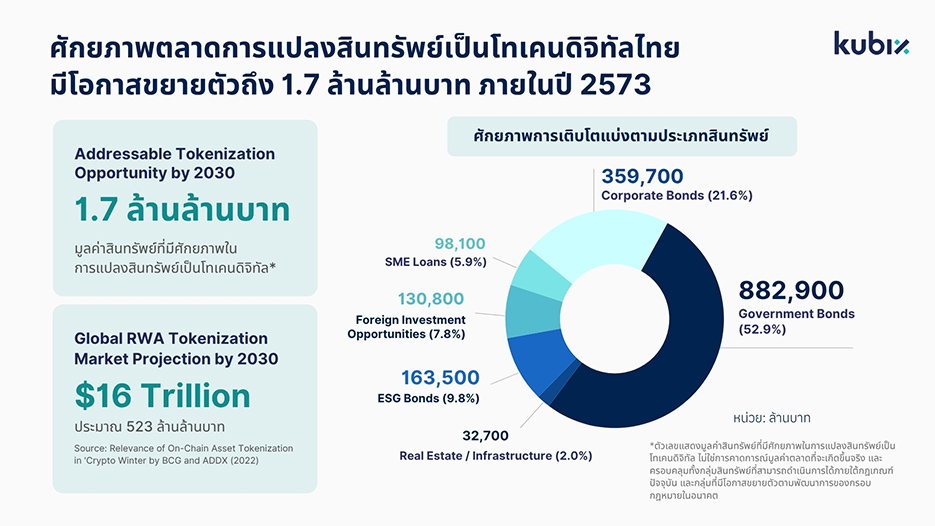 บริษัท คิวบิกซ์ ดิจิทัล แอสเสท จำกัด (kubix) ผู้ให้บริการระบบเสนอขายโทเคนดิจิทัล (ICO Portal) ชั้นนำของไทย ร่วมกับโอนิกิริ แคปิทัล (Onigiri Capital) กองทุนร่วมลงทุนในเครือเซย์ซอน แคปิทัล (Saison Capital) หน่วยงานด้านการลงทุนของกลุ่มบริษัทเครดิต เซย์ซอน ประเทศญี่ปุ่น เผยแพร่รายงานวิจัยเชิงลึก “Project Thara: Institutionalizing Real-World Asset Tokenization-Where Thailand’s Real Economy Meets Digital Capital” การยกระดับการแปลงสินทรัพย์ในโลกจริงเป็นโทเคนดิจิทัลในระดับสถาบัน เพื่อวิเคราะห์ศักยภาพและทิศทางการเติบโตของตลาดการแปลงสินทรัพย์เป็นโทเคนดิจิทัลในประเทศไทย คาดมีมูลค่าโอกาสทางเศรษฐกิจสูงถึง 51,000 ล้านดอลลาร์สหรัฐ หรือราว 1.7 ล้านล้านบาท ภายในปี 2573