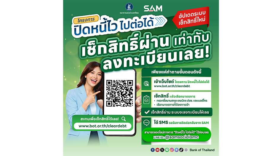 SAM เปิดช่องลูกหนี้ NPL เช็กสิทธิ์-ลงทะเบียน “ปิดหนี้ไว ไปต่อได้” ก่อนเที่ยวสงกรานต์ คลิกเดียวรู้ผลทันที ย้ำชัดระบบเช็กง่าย ปลอดภัย 100%