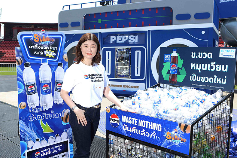 นางสาววิภาวรรณ ทัศนปรีชาชัย รองประธานบริหารฝ่ายบรรษัทสัมพันธ์ บริษัท ซันโทรี่ เป๊ปซี่โค เบเวอเรจ (ประเทศไทย) จำกัด กล่าวเสริมว่า “ซันโทรี่ เป๊ปซี่โค ประเทศไทย มีแนวคิดว่าบรรจุภัณฑ์ใช้แล้วไม่ควรถูกทิ้งเป็นขยะ แต่ควรเป็นทรัพยากรที่สามารถหมุนเวียนกลับมาใช้ใหม่ได้ เราจึงส่งเสริมการจัดการบรรจุภัณฑ์อย่างยั่งยืน โดยขับเคลื่อนแคมเปญ ‘Waste Nothing – มันส์ แล้ว ทิ้ง’ อย่างต่อเนื่อง ผ่านเทศกาลดนตรีและกิจกรรมที่แบรนด์เป๊ปซี่สนับสนุน (Event-Based Packaging Sustainability) เพื่อเปิดโอกาสให้ผู้บริโภคมีส่วนร่วมในการคัดแยกขยะด้วยตนเองและส่งต่อบรรจุภัณฑ์ใช้แล้วกลับเข้าสู่กระบวนการรีไซเคิล โดยเฉพาะขวด PET ใสไม่มีสี ที่สามารถเข้าสู่กระบวนการ ‘Bottle-to-Bottle Recycling’ เพื่อกลับมาผลิตเป็นขวดใหม่ได้อีกครั้ง แนวทางนี้ไม่เพียงช่วยลดการใช้ทรัพยากรใหม่และลดปริมาณขยะสู่หลุมฝังกลบ แต่ยังเป็นส่วนหนึ่งของการขับเคลื่อนเศรษฐกิจหมุนเวียนอย่างเป็นรูปธรรม ที่สะท้อนถึงความมุ่งมั่นของบริษัทฯ ในการเติบโตไปพร้อมกับการดูแลสังคมและสิ่งแวดล้อมตามค่านิยมองค์กร ‘การเติบโตอย่างยั่งยืน’ (Growing for Good)”