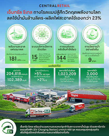 เซ็นทรัล รีเทล กางโรดแมปสู้ศึกวิกฤตพลังงานโลก ลดใช้น้ำมันล้านลิตร-ผลิตไฟสะอาดใช้เองกว่า 23% พร้อมดูแลลูกค้า-คู่ค้าอย่างยั่งยืน