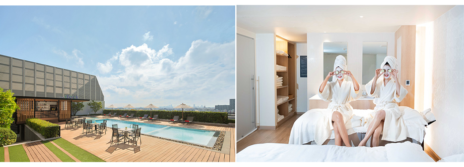ห้องพักทุกห้องได้รับการออกแบบเพื่อตอบโจทย์ไลฟ์สไตล์คนเมืองยุคใหม่ โดดเด่นด้วยหน้าต่างบานใหญ่ที่เปิดรับแสงธรรมชาติอย่างเต็มที่ ให้ผู้เข้าพักสามารถชมวิวเส้นขอบฟ้ากรุงเทพฯ แบบพาโนรามา แพ็กเกจนี้รวมการเข้าพัก 1 คืน พร้อมบุฟเฟ่ต์อาหารเช้า และทรีตเมนต์สปาสำหรับ 2 ท่าน โดยแขกผู้ใช้บริการสามารถเลือกผ่อนคลายกับการนวดอโรม่า (Gentle Rhythm)  60 นาที หรือเติมพลังด้วยการนวดแผนไทย 90 นาที นอกจากนี้แขกผู้ใช้บริการยังสามารถยกระดับประสบการณ์การเข้าพักด้วยส่วนลด 20% สำหรับอาหารและเครื่องดื่ม ณ ห้องอาหารกรีนเฮ้าส์และเทอเรซ บาร์ และส่วนลด 20% สำหรับบริการทรีตเมนต์สปาเพิ่มเติม