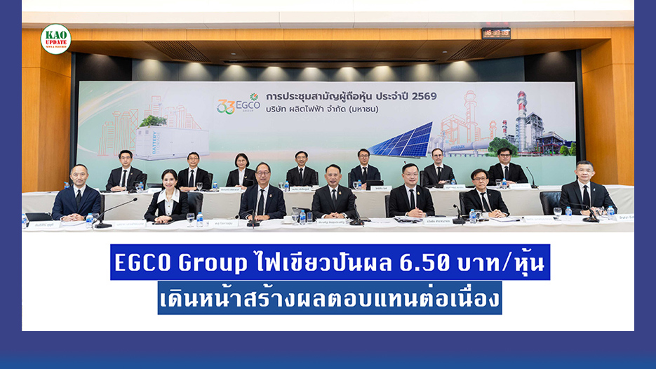 EGCO Group จัดประชุมสามัญผู้ถือหุ้นปี 2569 ในรูปแบบออนไลน์ อนุมัติจ่ายปันผลครึ่งปีหลัง 3.25 บาท/หุ้น ดันยอดรวมทั้งปีแตะ 6.50 บาท/หุ้น สะท้อนความแข็งแกร่งธุรกิจและความมุ่งมั่นสร้างผลตอบแทนที่มั่นคงให้ผู้ถือหุ้น