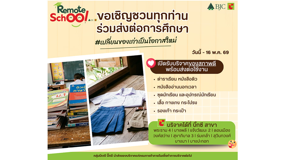 นอกเหนือจากการส่งมอบความคุ้มค่า บิ๊กซียังเดินหน้าสานต่อภารกิจด้านสังคม ผ่านโครงการ Remote School ปีที่ 23” โดยเปิดรับบริจาคชุดนักเรียนและอุปกรณ์การเรียนในสภาพดี ภายใต้กิจกรรม “เปลี่ยนของเก่าเป็นโอกาสใหม่” เพื่อส่งต่อโอกาสทางการศึกษาให้กับเด็กนักเรียนในพื้นที่ขาดแคลน โดยเปิดจุดรับบริจาค ณ บิ๊กซี 10 สาขานำร่อง ได้แก่ เอ็กซ์ตร้า พระราม 4, บางพลี, แจ้งวัฒนะ 2, ดอนเมือง, วงศ์สว่าง, สุขาภิบาล 3, ร่มเกล้า, สุวินทวงศ์, บางนา และบางปะกอก เพื่อนำไปมอบให้ผู้ด้อยโอกาสในช่วงปลายเดือนพฤษภาคมนี้