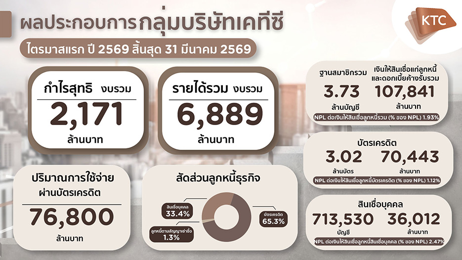KTC รายงานผลการดำเนินงานไตรมาส 1/2569 มีกำไรสุทธิ 2,171 ล้านบาท เพิ่มขึ้น 16.7% จากช่วงเดียวกันปีก่อน ท่ามกลางภาวะเศรษฐกิจที่ยังเผชิญแรงกดดันจากปัจจัยภายนอกและกำลังซื้อในประเทศที่ชะลอตัว ขณะที่พอร์ตสินเชื่อรวมอยู่ที่ 107,841 ล้านบาท เติบโต 0.7% สะท้อนแนวทางการดำเนินธุรกิจที่เน้น “คุณภาพพอร์ต” มากกว่าการเร่งขยายตัว