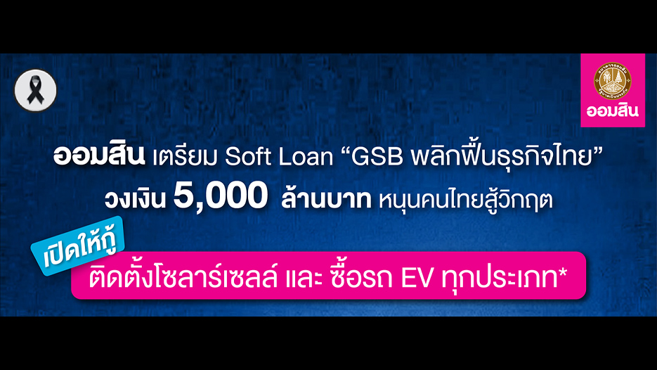 นายทรงพล ชีวะปัญญาโรจน์ ผู้อำนวยการธนาคารออมสิน เปิดเผยว่า ตามที่คณะรัฐมนตรีมีมติเห็นชอบให้ธนาคารออมสินจัดทำโครงการสินเชื่อดอกเบี้ยต่ำ หรือ Soft Loan GSB พลิกฟื้นธุรกิจไทย เพื่อเสริมสภาพคล่องช่วยประชาชนและผู้ประกอบการ รวมถึงสนับสนุนการขยายธุรกิจของ SMEs วงเงินโครงการ 100,000 ล้านบาท โดยส่วนหนึ่งให้จัดสรรสำหรับปล่อยสินเชื่อที่สนับสนุนการปรับตัวของประชาชนเพื่อให้เกิดความยั่งยืนด้านพลังงาน ในช่วงเวลาที่สถานการณ์โลกมีความผันผวน ได้แก่ สินเชื่อเพื่อติดตั้งโซลาร์เซลล์ และ สินเชื่อเพื่อการซื้อยานยนต์ไฟฟ้าทุกประเภท รวมวงเงินทั้ง 2 สินเชื่อที่ได้รับจัดสรรตามวัตถุประสงค์นี้ เป็นเงิน 5,000 ล้านบาท
