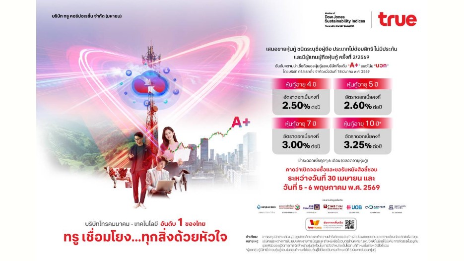 ทรู คอร์ปอเรชั่น ผู้นำโทรคมนาคมเทคโนโลยีของไทย และได้รับการจัดอันดับติด Top 1% บริษัทที่มีความยั่งยืนที่สุดของโลกจาก S&P Global ต่อเนื่องเป็นปีที่ 8 ตามรายงาน Sustainability Yearbook 2026 ตอกย้ำสถานะธุรกิจที่มั่นคงและศักยภาพการเติบโตอย่างยั่งยืนในระยะยาว ท่ามกลางภาวะตลาดการเงินผันผวน นำเสนอทางเลือกการลงทุนคุณภาพสำหรับผู้ลงทุนทั่วไป เตรียมเสนอขายหุ้นกู้ชุดใหม่ จำนวน 4 ชุด อายุตั้งแต่ 4 ปี ถึง 10 ปี ด้วยอัตราดอกเบี้ยคงที่ตั้งแต่ 2.50 – 3.25% ต่อปี จ่ายดอกเบี้ยทุกๆ 6 เดือน ด้วยอันดับความน่าเชื่อถือที่ระดับ “A+” แนวโน้ม “บวก” (Positive) จากบริษัท ทริสเรทติ้ง จำกัด เมื่อวันที่ 18 มีนาคม 2569 สะท้อนความเชื่อมั่นของพื้นฐานธุรกิจที่แข็งแกร่ง รวมถึงบทบาทของทรูในการพัฒนาโครงสร้างพื้นฐานดิจิทัลของประเทศ คาดเปิดจองซื้อระหว่างวันที่ 30 เมษายน และวันที่ 5– 6 พฤษภาคม 2569 ผ่าน 7 สถาบันการเงินชั้นนำได้แก่ ธ.กรุงเทพ ธ.กสิกรไทย ธ.ไทยพาณิชย์ ธ.ซีไอเอ็มบีไทย ธ.ยูโอบี บล.เกียรตินาคินภัทร และ บล.เอเซีย พลัส รวมถึงการขายผ่านแอปพลิเคชัน TrueMoney Wallet โดยมีธนาคารกรุงศรีอยุธยาเป็นนายทะเบียนหุ้นกู้และผู้แทนผู้ถือหุ้นกู้