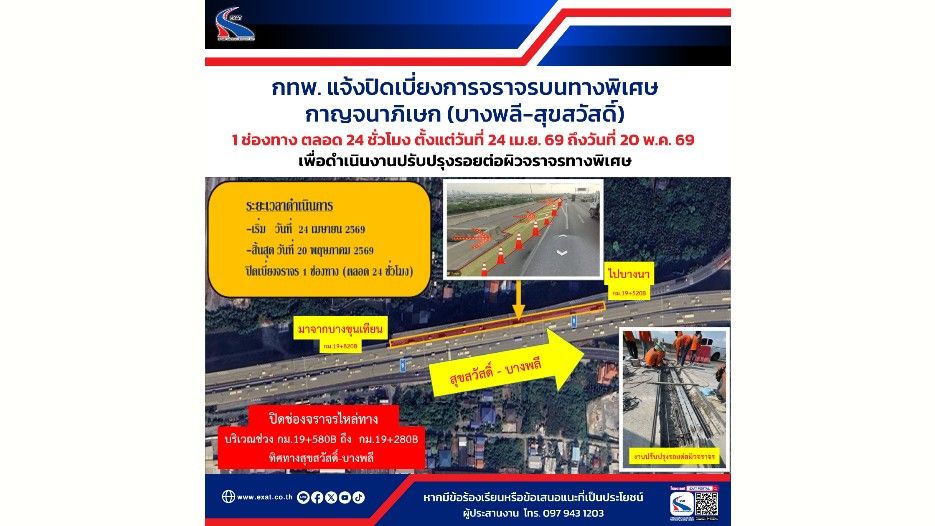 การทางพิเศษแห่งประเทศไทย (กทพ.) กระทรวงคมนาคม ได้ว่าจ้าง กิจการร่วมค้า DW เพื่อดำเนินงานปรับปรุงรอยต่อผิวจราจรทางพิเศษกาญจนาภิเษก (บางพลี-สุขสวัสดิ์) ช่วง กม.19+520 ถึง กม.19+820 ทิศทางบางพลี-สุขสวัสดิ์ และช่วง กม.19+580 ถึง กม.19+280 ทิศทางสุขสวัสดิ์-บางพลี โดยผู้รับจ้างจะเข้าดำเนินงานปรับปรุงรอยต่อผิวจราจรดังกล่าว จึงมีความจำเป็นต้องปิดเบี่ยงการจราจรบนทางพิเศษกาญจนาภิเษก (บางพลี-สุขสวัสดิ์) บริเวณ กม.19+580 B ถึง กม.19+280 B ทิศทางสุขสวัสดิ์-บางพลี 1 ช่องทาง ตลอด 24 ชั่วโมง ตั้งแต่วันที่ 24 เมษายน 2569 ถึงวันที่ 20 พฤษภาคม 2569